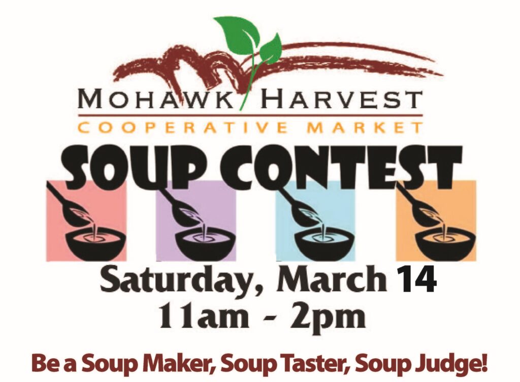 $10 buys a ticket to try all the soups that are entered in the contest and allows each person to vote for the best soup in each category. This is a fundraiser & friendraiser for Mohawk Harvest. Bring a friend to enjoy the tasty soups and to support your co-op.